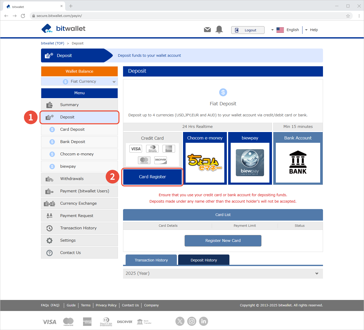 1. Wählen Sie „Einzahlung“ (①) aus dem Menü und klicken Sie auf „Kartenregistrierung“ (②).