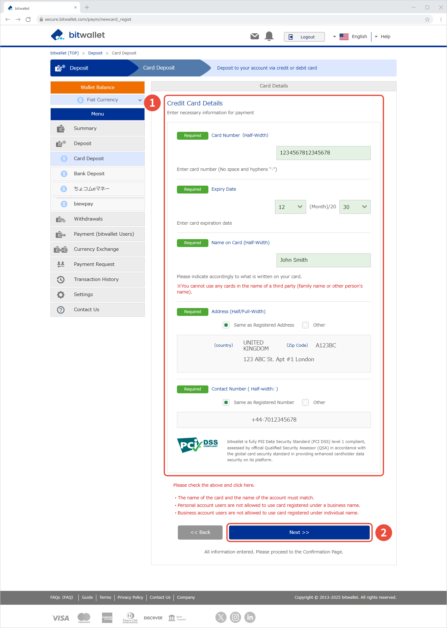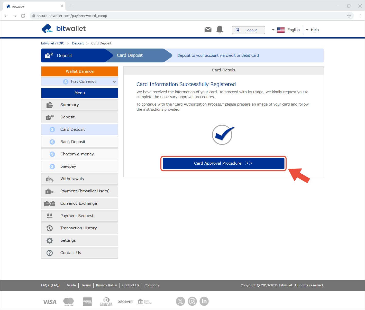 bitwallet erfordert, dass Sie Ihre Kredit-/Debitkarte registrieren, bevor Sie eine Einzahlung tätigen können. Die Anzahl der Karten, die registriert werden können, hängt von Ihrem Kontostatus ab.