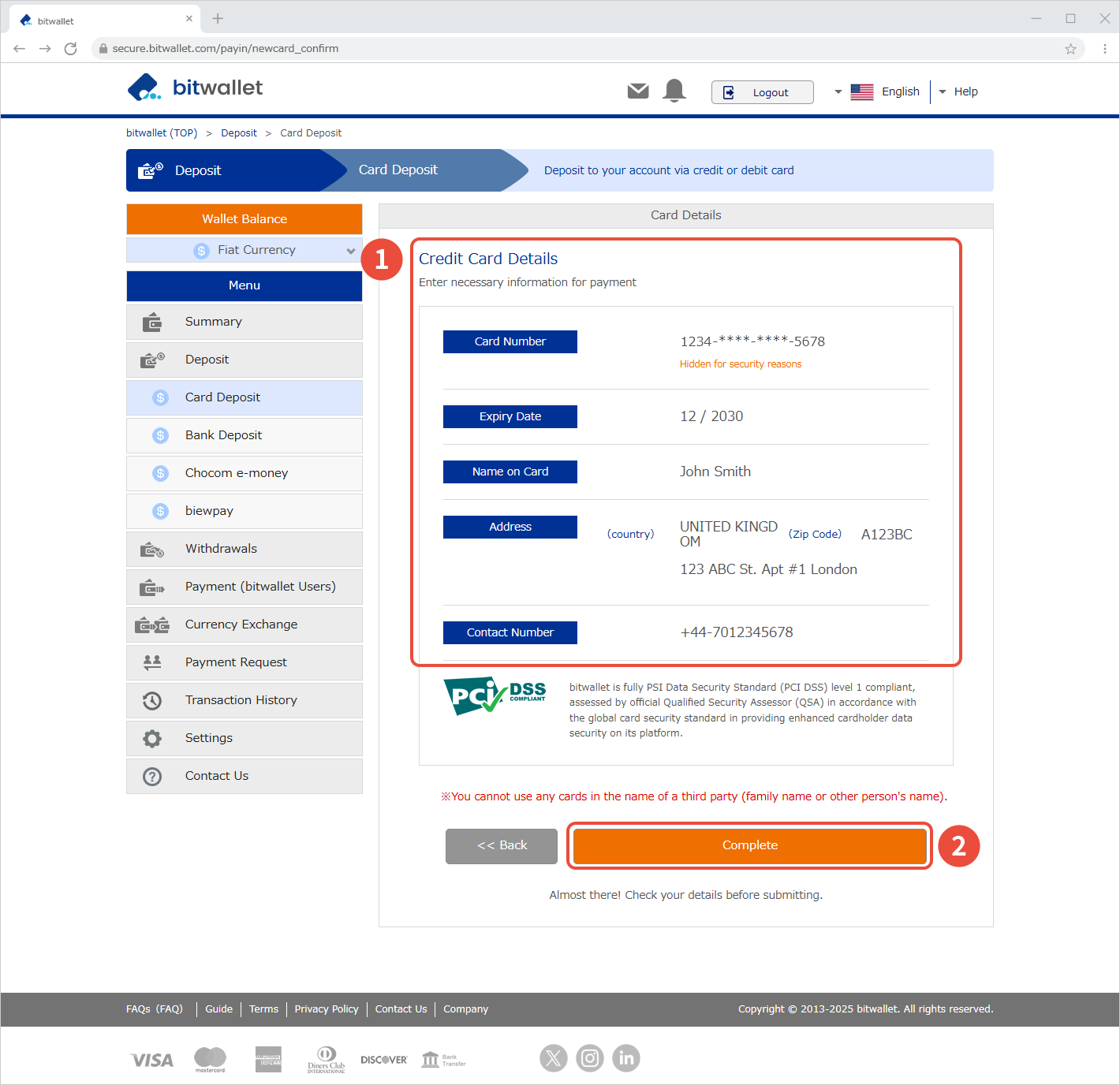 bitwallet akzeptiert keine Einzahlungen im Namen Dritter. Der Name auf der Karte muss mit Ihrem eigenen Namen und dem bei bitwallet registrierten Namen übereinstimmen. Wird eine unter dem Namen eines Dritten getätigte Einzahlung festgestellt, wird das Konto gesperrt.