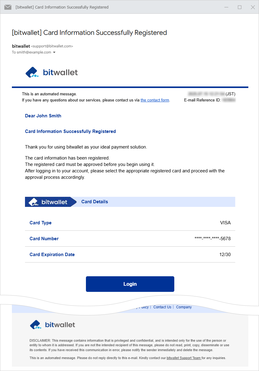 5. Nachdem der Kredit-/Debitkarten-Registrierungsprozess abgeschlossen ist, wird eine E-Mail mit dem Titel „Registrierung der Karteninformationen abgeschlossen“ an Ihre registrierte E-Mail-Adresse gesendet. Die E-Mail enthält den Kartentyp, den Sie dieses Mal registriert haben, die letzten 4 Ziffern der Kartennummer und das Ablaufdatum der Karte.