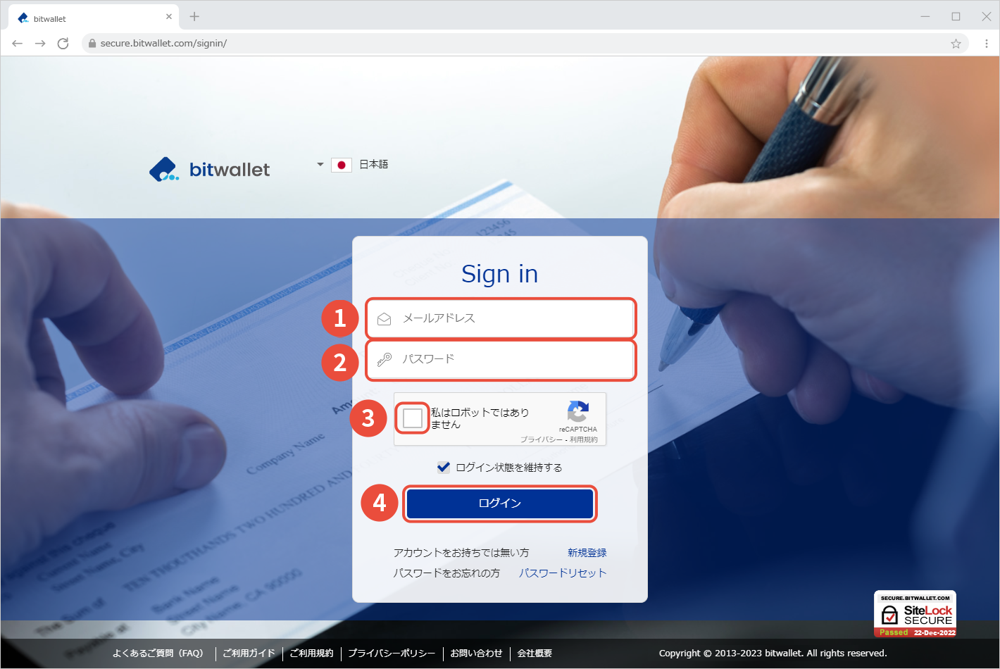 bitwallet(ビットウォレット)をご利用いただく際には、アカウント開設時に登録したメールアドレスとパスワードを使ってログインします。
