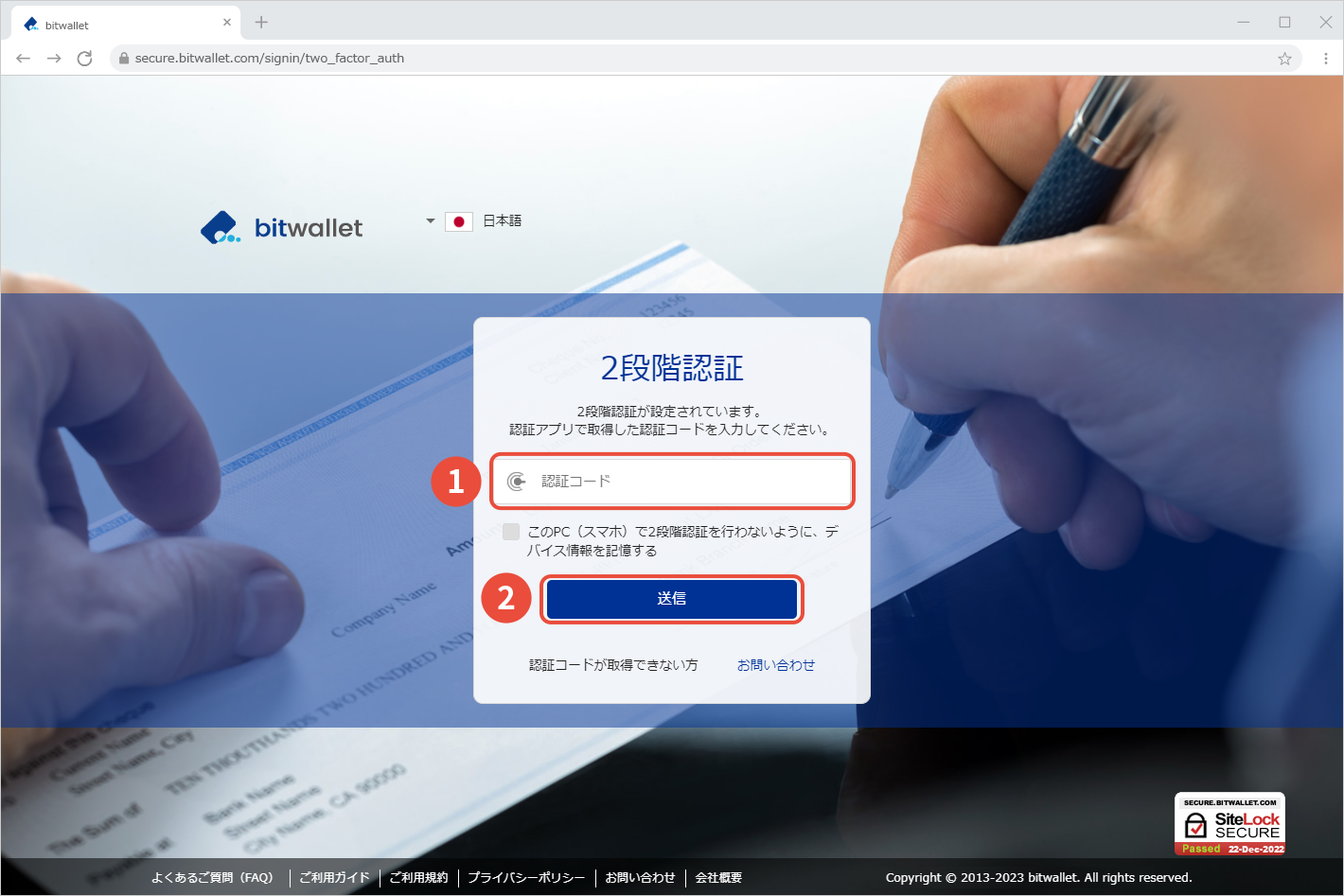 3. 2段階認証を設定している場合には、ログイン画面のあとに「2段階認証」画面が表示されます。「2段階認証」画面では「認証コード」(①)を入力して「送信」(②)をクリックします。