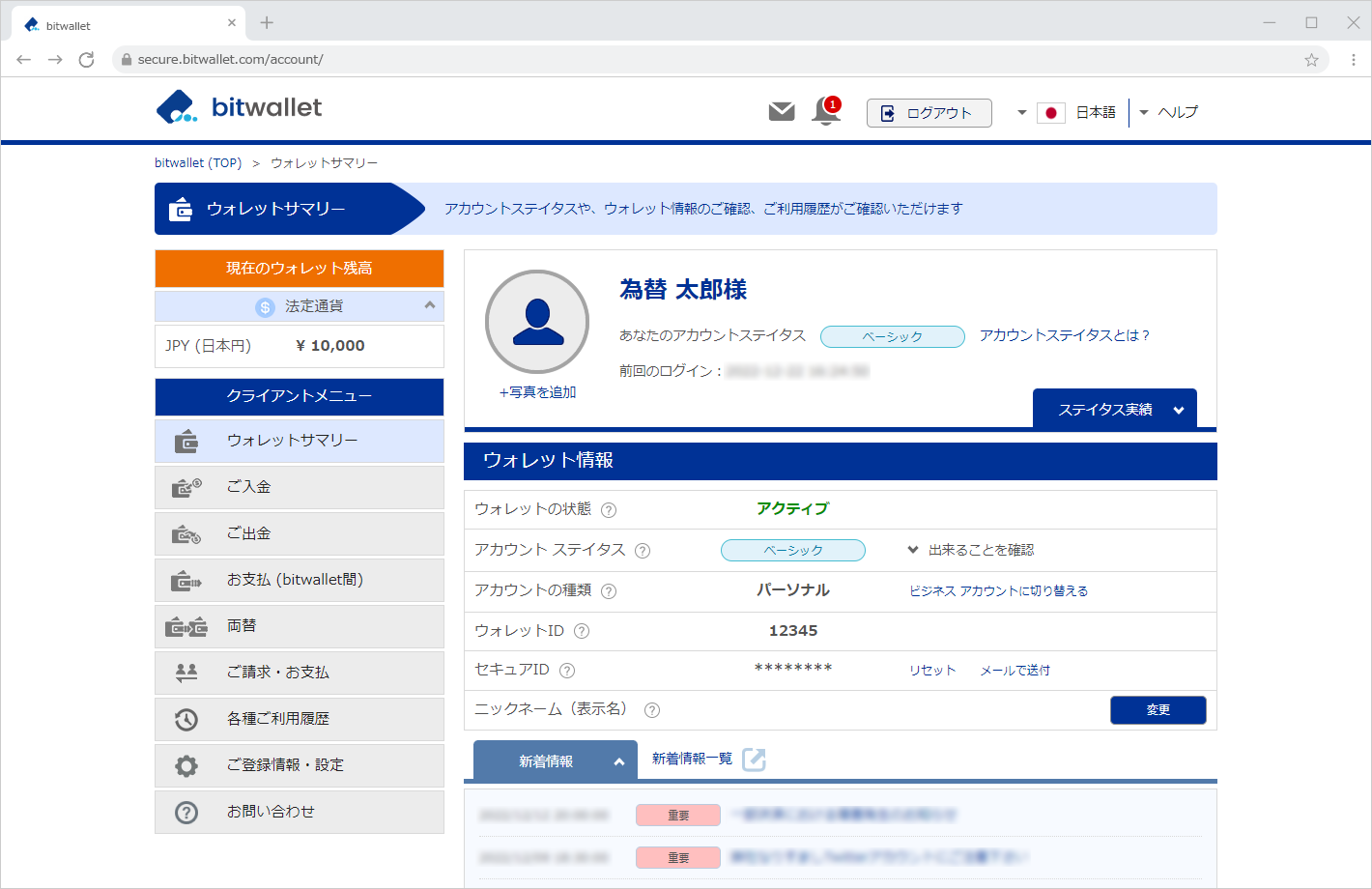 4. bitwalletへのログインが完了すると、「ウォレットサマリー」が表示されます。
