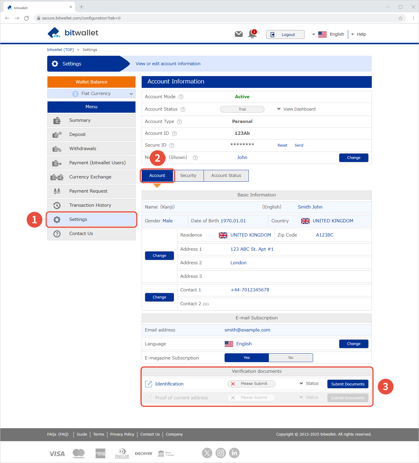 1. ជ្រើសរើស "ការកំណត់" (①) ពីម៉ឺនុយ បន្ទាប់មកចូលទៅកាន់ "ឯកសារផ្ទៀងផ្ទាត់" (③) ក្រោម "គណនី" (②) ដាក់ឯកសារសម្រាប់ "អត្តសញ្ញាណ" និង "ភស្តុតាងនៃអាសយដ្ឋានបច្ចុប្បន្ន" ។