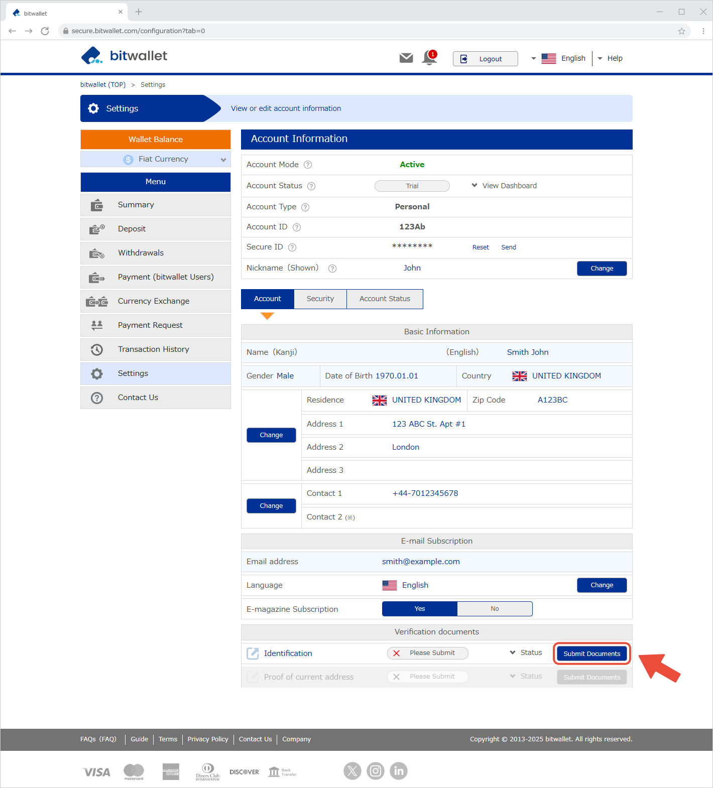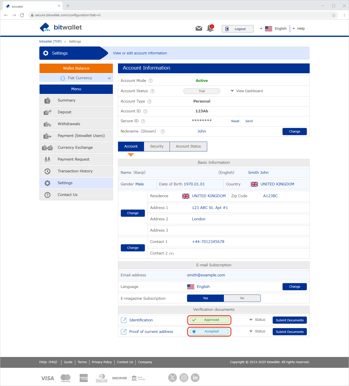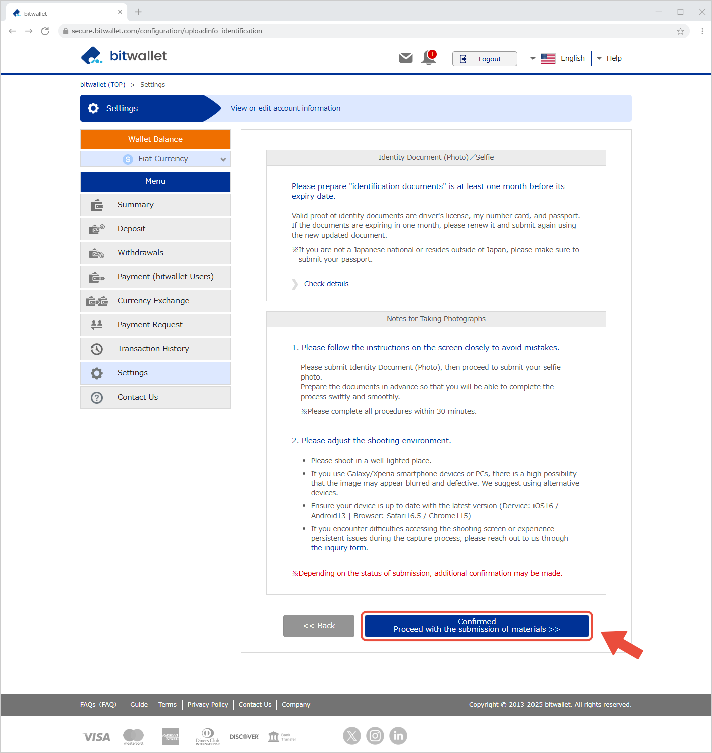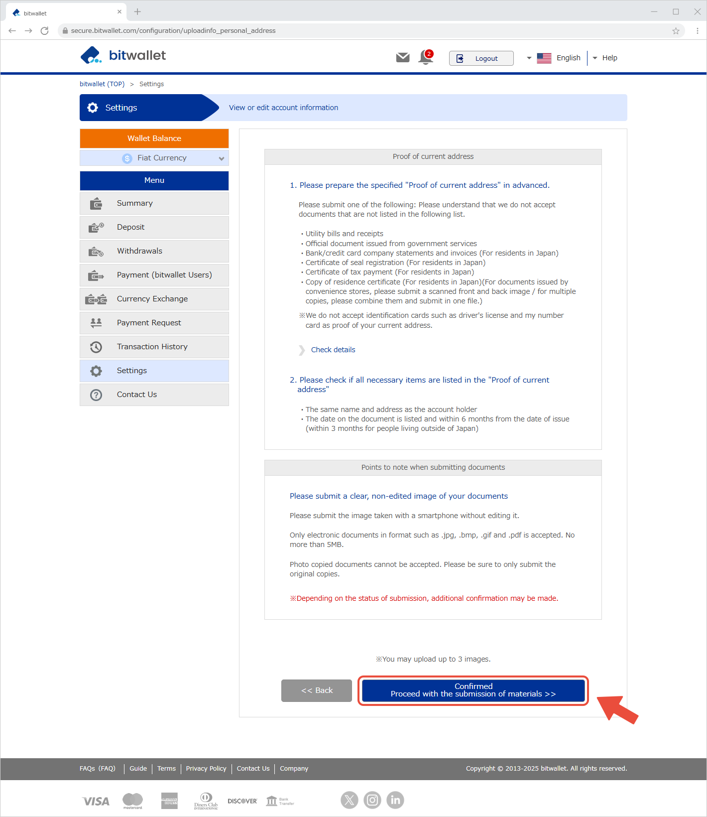 ដើម្បីផ្ទៀងផ្ទាត់អត្តសញ្ញាណរបស់អ្នក bitwallet តម្រូវឱ្យអ្នកដាក់ឯកសារអត្តសញ្ញាណរបស់អ្នក និងឯកសារផ្ទៀងផ្ទាត់អាសយដ្ឋានបច្ចុប្បន្ន។ បន្ទាប់ពីការអនុម័តវិញ្ញាបនបត្រនីមួយៗត្រូវបានបញ្ចប់ សេវាកម្មដែលមាននៅលើ bitwallet នឹងត្រូវបានពង្រីក។