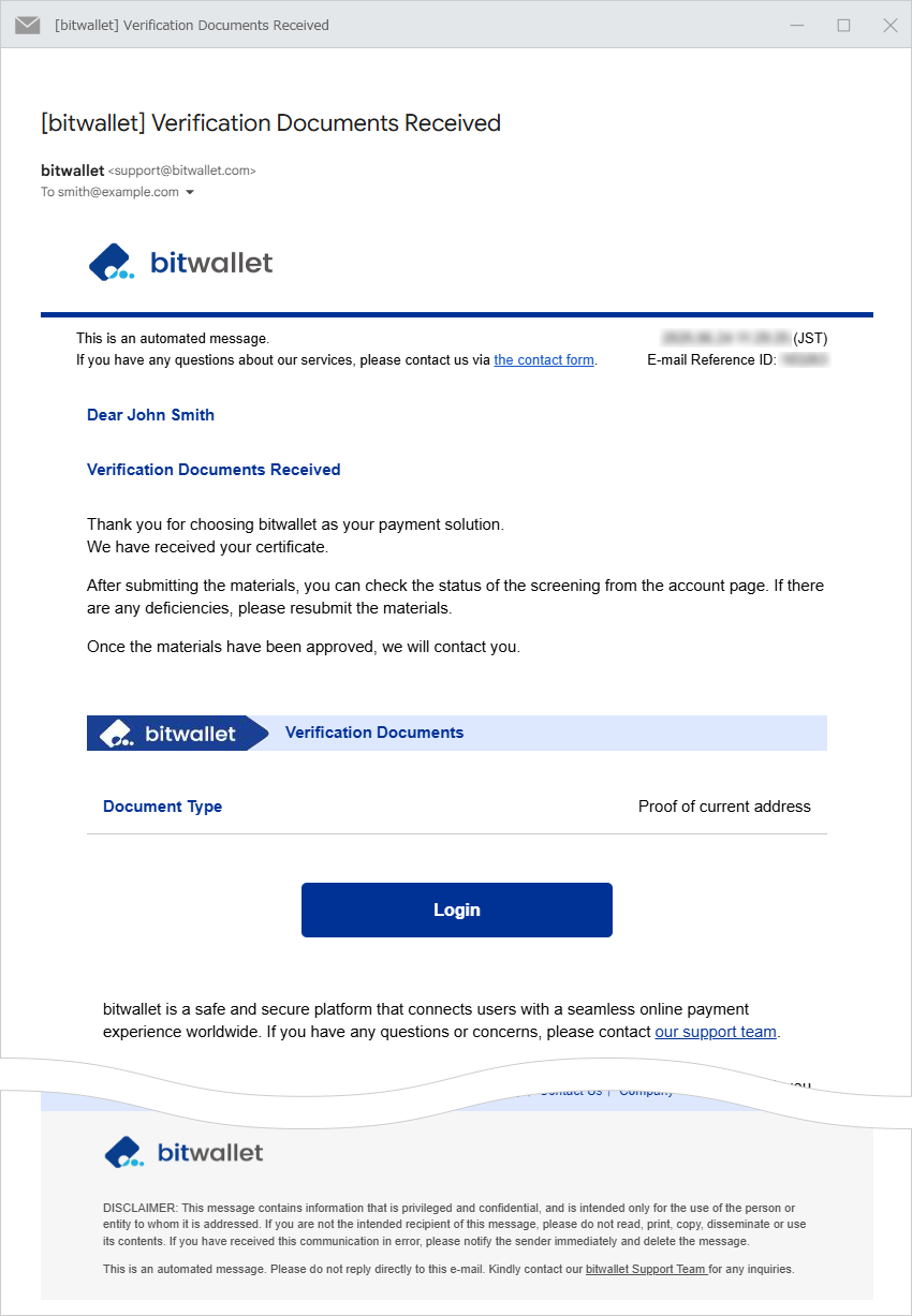 9. បន្ទាប់ពីដាក់ស្នើឯកសាររបស់អ្នក អ៊ីមែលដែលមានចំណងជើងថា "ឯកសារផ្ទៀងផ្ទាត់ដែលបានទទួល" នឹងត្រូវបានផ្ញើទៅកាន់អាសយដ្ឋានអ៊ីមែលដែលបានចុះឈ្មោះរបស់អ្នក។ អ៊ីមែលនឹងរួមបញ្ចូលប្រភេទឯកសារដែលអ្នកបានដាក់ស្នើ។