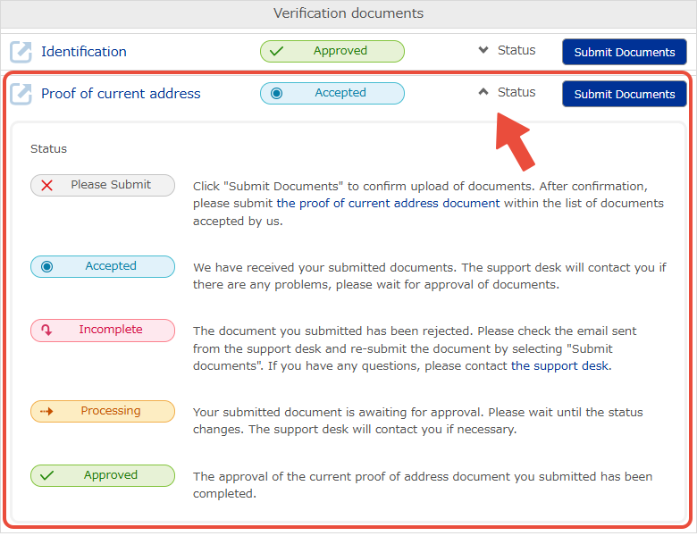 ចុចលើ "ស្ថានភាព" នៅក្រោម "ឯកសារផ្ទៀងផ្ទាត់" ដើម្បីមើលស្ថានភាពបច្ចុប្បន្នរបស់អ្នក។