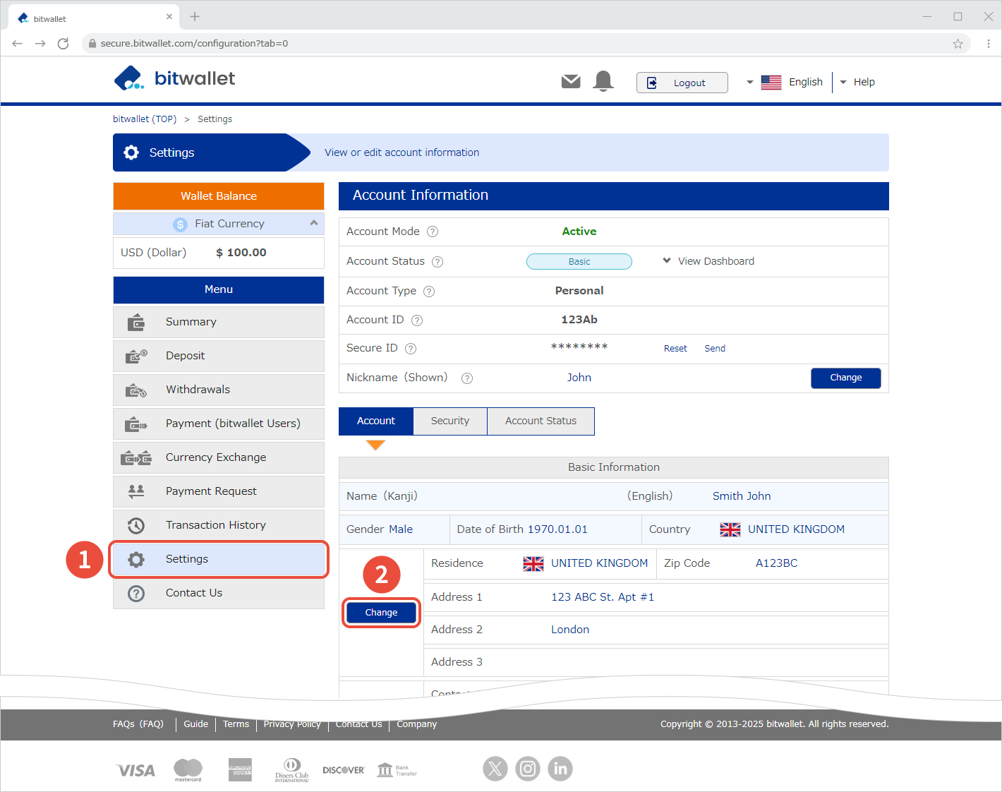 1. Pilih “Tetapan” (①) daripada menu, dan klik “Tukar” (②) untuk alamat berdaftar di bawah “Maklumat Asas” dalam bahagian “Akaun”.