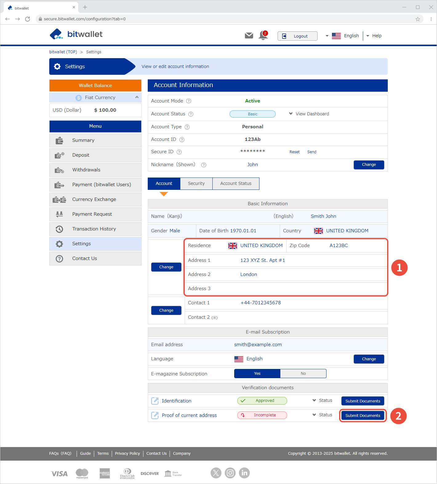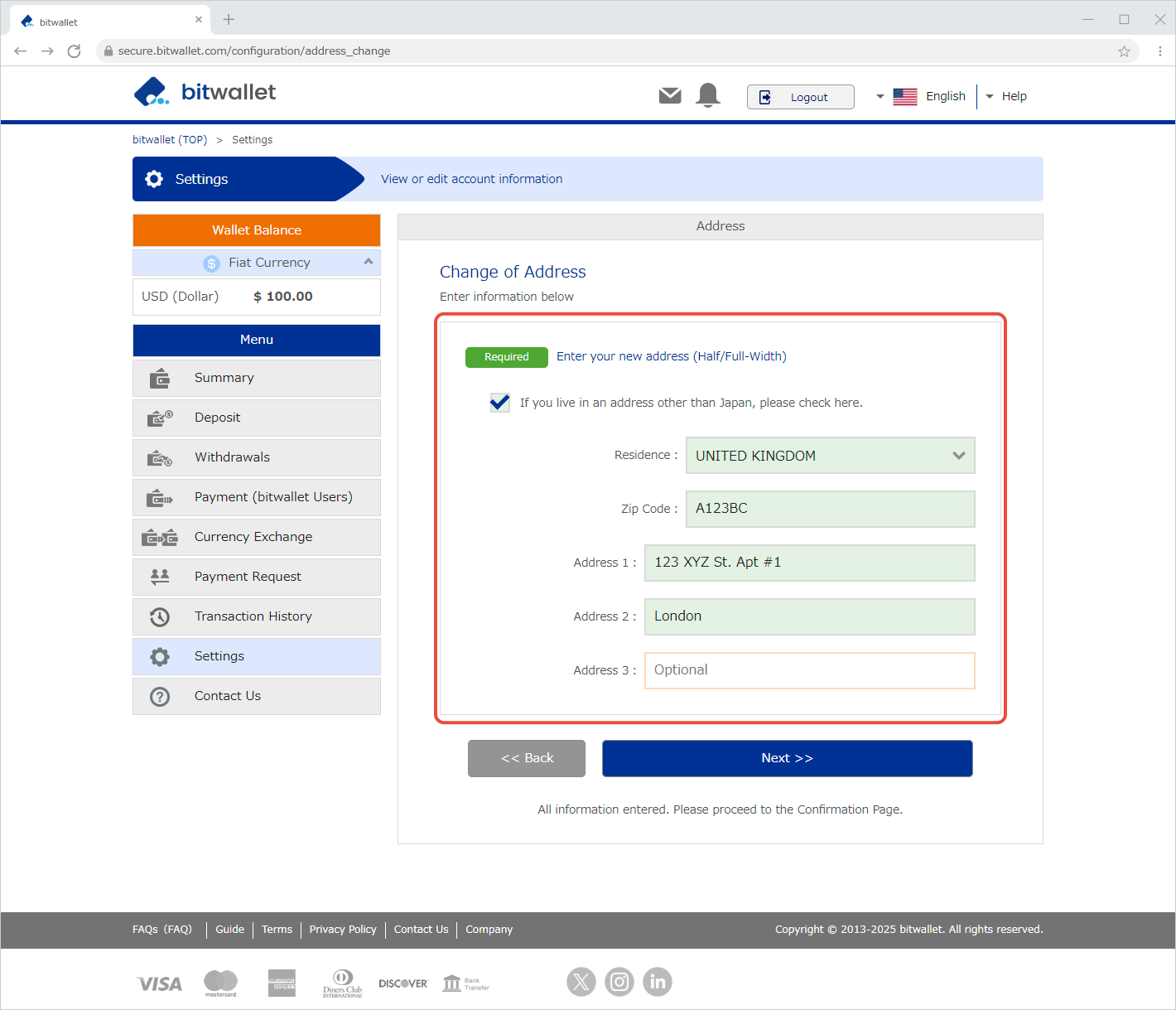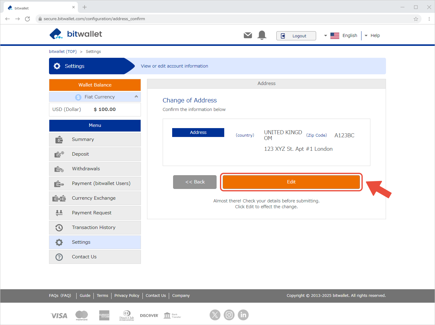bitwallet membolehkan anda menukar alamat berdaftar anda dengan mudah jika anda menukar alamat anda kerana berpindah atau sebab lain. Untuk menukar alamat anda, anda perlu memberikan bukti alamat semasa anda yang dikeluarkan dalam tempoh 6 bulan yang lalu.