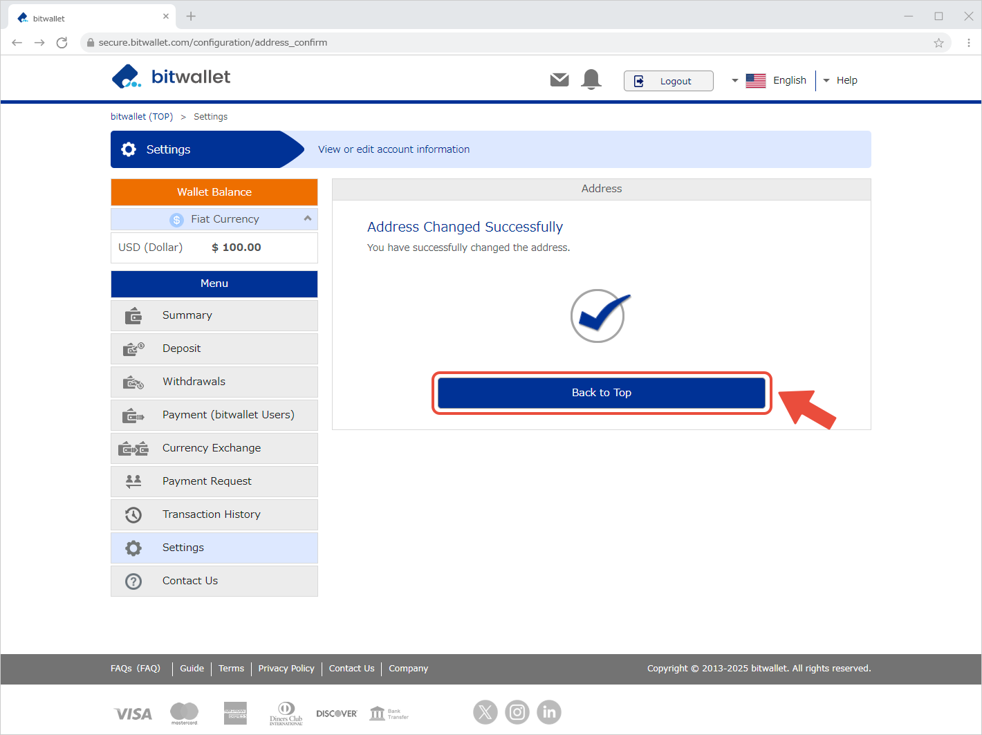 5. Apabila "Alamat Berjaya Berubah" dipaparkan, pertukaran alamat anda selesai. Klik "Kembali ke Atas".