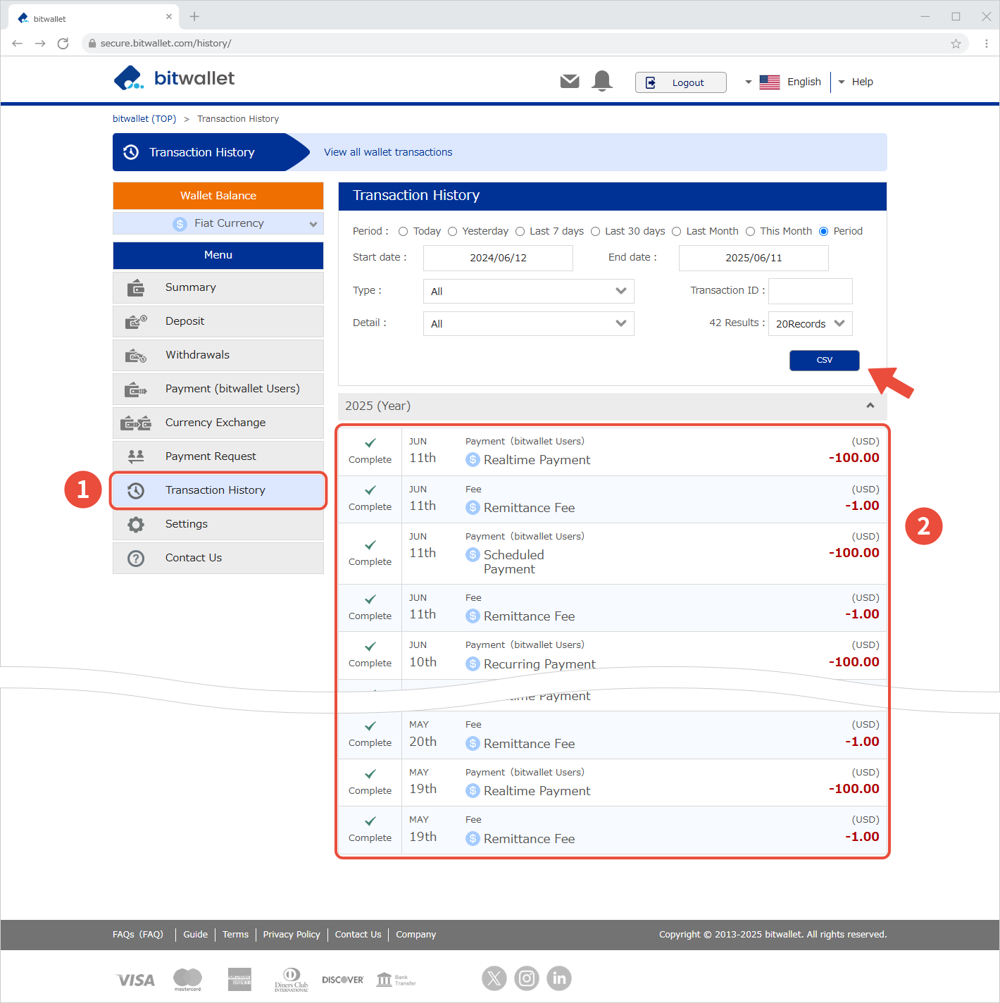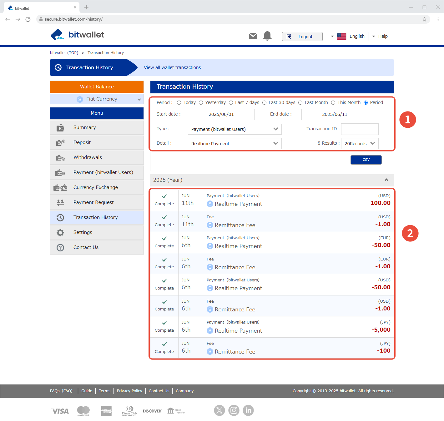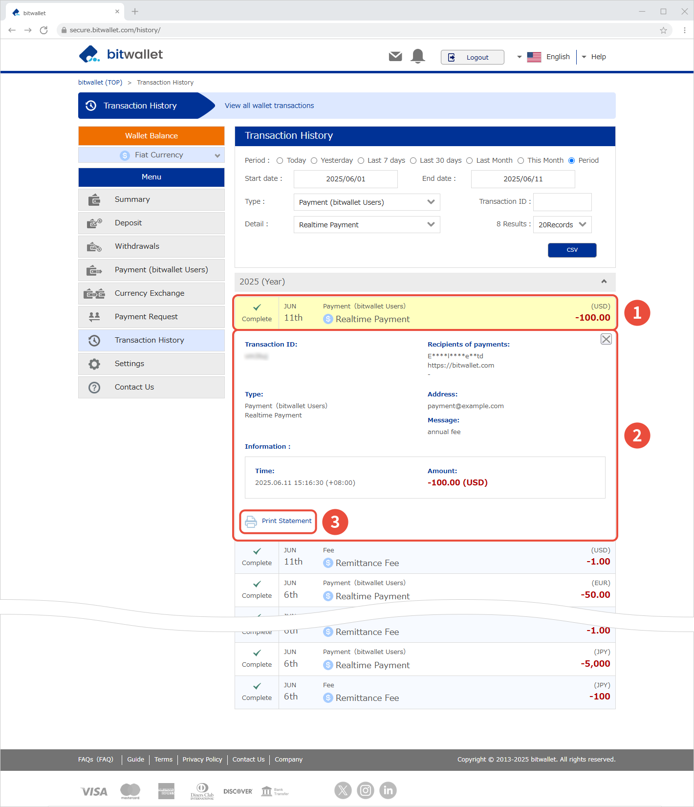 Katika sehemu ya "Historia ya Muamala" ya bitwallet, unaweza kuona orodha ya historia yako mbalimbali ya miamala, ikijumuisha amana, uondoaji, malipo kati ya watumiaji na ubadilishanaji wa sarafu. Unaweza kutoa historia mahususi za miamala kwa muda au maelezo ya muamala, au kwa kubainisha kitambulisho cha muamala kilichotolewa kwa kila muamala.