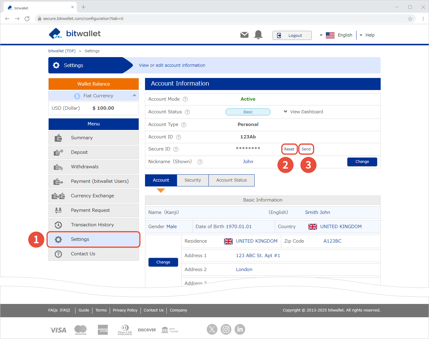 1. Chagua "Mipangilio" (①) kutoka kwenye menyu, na katika "Maelezo ya Akaunti", bofya "Weka Upya" (②) ili kuweka upya Kitambulisho chako Salama, au ubofye "Tuma" (③) ili kutuma kwa barua pepe.